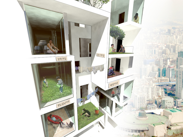 정원은 삶의 단편적인 모습들이 드러나는 공간으로 거주자들의 삶의 연장선상의 공간이며 삶의 일부를 공유하여 소통할 수 있는 가능성의 공간입니다. 기존 단독주택에 면하는 가로의 소통 가능성을 수직 코어로 실현하고 일부 발코니를 수직코어에 면함으로서 세 개의 접점과 맞물리고 각각의 성격에 맞는 다양한 의미를 내포하는 공간이 됩니다. 집의 문화를 만든다는 의미의 포괄적인 Homemaker들은 이러한 공간을 효과적으로 사용함으로서 시각적 공유와 커뮤니티를 이끌어내어 도심 내 새로운 거주풍경을 제시해 낼 것입니다.
