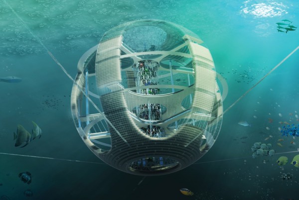 In the middle of the Pacific Ocean sits a mass of garbage that is 8.1% the size of the entire sea. It is known as the Great Pacific Garbage Patch (GPGP), and is estimated to contain over 100 million tons of waste. The debris gathers in that particular location as ocean currents convene in the Subtropical Convergence Region, and is causing grave harm to the immediate ecosystem and those within a broad surrounding swath.The Plastic Fish Tower, a circular structure floating on the ocean surface within the GPGP, will collect and reprocess plastic, which estimates say comprises 90% of the GPGP and is often ingested by birds and fish, causing their demise. A large fence will circle the structure underwater in a 1 km diameter to capture all the plastic that floats its way. The plastic will be recycled within the structure and processed into plastic patches that can be assembled into fish farms to restore the ecosystem. In addition to helping mitigate the pollution, the fish farm will also have two added benefits: the buoyancy of the plastic fish farm elements will be enough to keep the entire structure afloat since plastic is in fact so buoyant, and it will position the structure as a tourist attraction. Bringing tourists to the GPGP would greatly help in disseminating widely the reality of this manmade ecological catastrophe. The tourists will be transported to and from the site by ships that are fueled by chemicals that will be collected from the processed plastics within the skyscraper in an as-of-yet-undiscovered method of chemical extraction.The structure itself is a ring that rises above the water and also goes below, but is largely hollow. The outer ring holds residential and leisure spaces, and is connected at intervals by bridges that are enclosed underwater (and one that is open on the water’s surface). Fishing banks made from the recycled plastic funnel up through the middle of the ring, helping to keep the structure buoyant.
