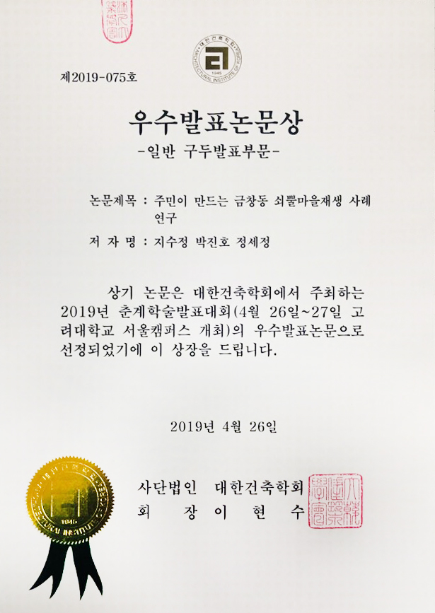 2019 대한건축학회 춘계학술발표대회에서 우수발표논문상을 수상하였습니다.