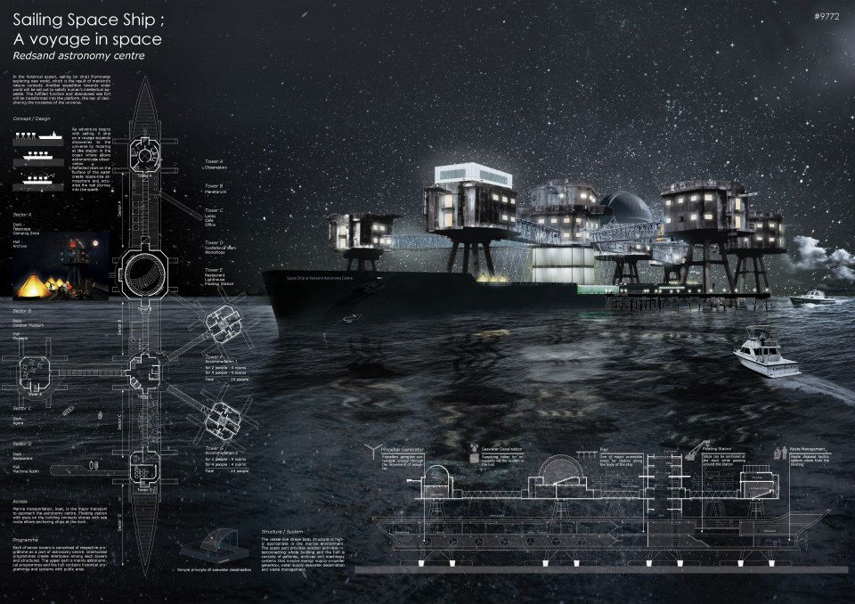 Vessel-like shape structure, highly appropriate in the marine environment, allows transforming abandoned fort into the space-exploring platform.